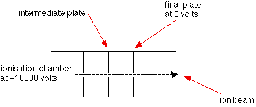 Note: As you will see in a moment, the whole ionisation chamber is held at a positive voltage of about 10,000 volts. Where we are talking about the two plates having positive charges, these charges are in addition to that 10,000 volts. | ||