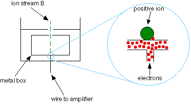 Assuming 1+ ions, stream A has the lightest ions, stream B the next lightest and stream C the heaviest. Lighter ions are going to be more deflected than heavy ones. Detection Only ion stream B makes it right through the machine to the ion detector. The other ions collide with the walls where they will pick up electrons and be neutralised. Eventually, they get removed from the mass spectrometer by the vacuum pump. When an ion hits the metal box, its charge is neutralised by an electron jumping from the metal on to the ion (right hand diagram). That leaves a space amongst the electrons in the metal, and the electrons in the wire shuffle along to fill it. A flow of electrons in the wire is detected as an electric current which can be amplified and recorded. The more ions arriving, the greater the current. Detecting the other ions How might the other ions be detected - those in streams A and C which have been lost in the machine? Remember that stream A was most deflected - it has the smallest value of m/z (the lightest ions if the charge is 1+). To bring them on to the detector, you would need to deflect them less - by using a smaller magnetic field (a smaller sideways force). To bring those with a larger m/z value (the heavier ions if the charge is +1) on to the detector you would have to deflect them more by using a larger magnetic field. If you vary the magnetic field, you can bring each ion stream in turn on to the detector to produce a current which is proportional to the number of ions arriving. The mass of each ion being detected is related to the size of the magnetic field used to bring it on to the detector. The machine can be calibrated to record current (which is a measure of the number of ions) against m/z directly. The mass is measured on the 12C scale. | ||