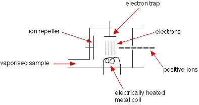 Stage 2: Acceleration The ions are accelerated so that they all have the same kinetic energy. Stage 3: Deflection The ions are then deflected by a magnetic field according to their masses. The lighter they are, the more they are deflected. The amount of deflection also depends on the number of positive charges on the ion - in other words, on how many electrons were knocked off in the first stage. The more the ion is charged, the more it gets deflected. Stage 4: Detection The beam of ions passing through the machine is detected electrically. A full diagram of a mass spectrometer Understanding what's going on The need for a vacuum It's important that the ions produced in the ionisation chamber have a free run through the machine without hitting air molecules. Ionisation The vaporised sample passes into the ionisation chamber. The electrically heated metal coil gives off electrons which are attracted to the electron trap which is a positively charged plate. The particles in the sample (atoms or molecules) are therefore bombarded with a stream of electrons, and some of the collisions are energetic enough to knock one or more electrons out of the sample particles to make positive ions. Most of the positive ions formed will carry a charge of +1 because it is much more difficult to remove further electrons from an already positive ion. These positive ions are persuaded out into the rest of the machine by the ion repeller which is another metal plate carrying a slight positive charge. | ||