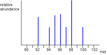What the mass spectrometer output looks like The output from the chart recorder is usually simplified into a "stick diagram". This shows the relative current produced by ions of varying mass/charge ratio. The stick diagram for molybdenum looks lilke this: You may find diagrams in which the vertical axis is labelled as either "relative abundance" or "relative intensity". Whichever is used, it means the same thing. The vertical scale is related to the current received by the chart recorder - and so to the number of ions arriving at the detector: the greater the current, the more abundant the ion. As you will see from the diagram, the commonest ion has a mass/charge ratio of 98. Other ions have mass/charge ratios of 92, 94, 95, 96, 97 and 100. That means that molybdenum consists of 7 different isotopes. Assuming that the ions all have a charge of 1+, that means that the masses of the 7 isotopes on the carbon-12 scale are 92, 94, 95, 96, 97, 98 and 100. | ||