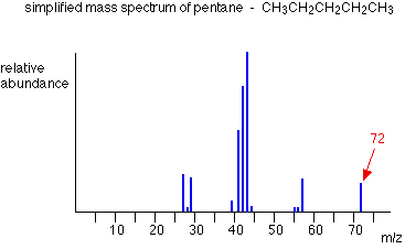 Using the molecular ion to find the relative formula mass In the mass spectrum, the heaviest ion (the one with the greatest m/z value) is likely to be the molecular ion. A few compounds have mass spectra which don't contain a molecular ion peak, because all the molecular ions break into fragments. That isn't a problem you are likely to meet at A'level. For example, in the mass spectrum of pentane, the heaviest ion has an m/z value of 72. | |||||||||||||||||||||||||||||||||||||||||||||||||||||