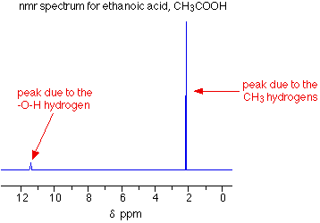 The peaks There are two peaks because there are two different environments for the hydrogens - in the CH3 group and attached to the oxygen in the COOH group. They are in different places in the spectrum because they need slightly different external magnetic fields to bring them in to resonance at a particular radio frequency. The sizes of the two peaks gives important information about the numbers of hydrogen atoms in each environment. It isn't the height of the peaks that matters, but the ratio of the areas under the peaks. If you could measure the areas under the peaks in the diagram above, you would find that they were in the ratio of 3 (for the larger peak) to 1 (for the smaller one). That shows a ratio of 3:1 in the number of hydrogen atoms in the two environments - which is exactly what you would expect for CH3COOH. The need for a standard for comparison - TMS Before we can explain what the horizontal scale means, we need to explain the fact that it has a zero point - at the right-hand end of the scale. The zero is where you would find a peak due to the hydrogen atoms in tetramethylsilane - usually called TMS. Everything else is compared with this. You will find that some NMR spectra show the peak due to TMS (at zero), and others leave it out. Essentially, if you have to analyse a spectrum which has a peak at zero, you can ignore it because that's the TMS peak. TMS is chosen as the standard for several reasons. The most important are: