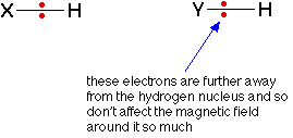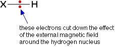 WHAT IS NUCLEAR MAGNETIC RESONANCE (NMR)? This page describes what a proton NMR spectrum is and how it tells you useful things about the hydrogen atoms in organic molecules. The background to NMR spectroscopy Nuclear magnetic resonance is concerned with the magnetic properties of certain nuclei. On this page we are focussing on the magnetic behaviour of hydrogen nuclei - hence the term proton NMR or 1H-NMR. Hydrogen atoms as little magnets If you have a compass needle, it normally lines up with the Earth's magnetic field with the north-seeking end pointing north. Provided it isn't sealed in some sort of container, you could twist the needle around with your fingers so that it pointed south - lining it up opposed to the Earth's magnetic field. It is very unstable opposed to the Earth's field, and as soon as you let it go again, it will flip back to its more stable state. Hydrogen nuclei also behave as little magnets and a hydrogen nucleus can also be aligned with an external magnetic field or opposed to it. Again, the alignment where it is opposed to the field is less stable (at a higher energy). It is possible to make it flip from the more stable alignment to the less stable one by supplying exactly the right amount of energy. The energy needed to make this flip depends on the strength of the external magnetic field used, but is usually in the range of energies found in radio waves - at frequencies of about 60 - 100 MHz. (BBC Radio 4 is found between 92 - 95 MHz!) It's possible to detect this interaction between the radio waves of just the right frequency and the proton as it flips from one orientation to the other as a peak on a graph. This flipping of the proton from one magnetic alignment to the other by the radio waves is known as the resonance condition. The importance of the hydrogen atom's environment What we've said so far would apply to an isolated proton, but real protons have other things around them - especially electrons. The effect of the electrons is to cut down the size of the external magnetic field felt by the hydrogen nucleus. Suppose you were using a radio frequency of 90 MHz, and you adjusted the size of the magnetic field so that an isolated proton was in the resonance condition. If you replaced the isolated proton with one that was attached to something, it wouldn't be feeling the full effect of the external field any more and so would stop resonating (flipping from one magnetic alignment to the other). The resonance condition depends on having exactly the right combination of external magnetic field and radio frequency. How would you bring it back into the resonance condition again? You would have to increase the external magnetic field slightly to compensate for the effect of the electrons. Now suppose that you attached the hydrogen to something more electronegative. The electrons in the bond would be further away from the hydrogen nucleus, and so would have less effect on the magnetic field around the hydrogen. | ||