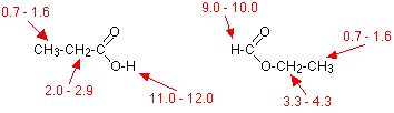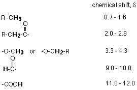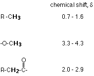 Notes: "R" represents an alkyl group (like methyl, ethyl, etc) which in this case may have other things substituted in it. The shifts are shown as ranges of values. The exact position varies depending on what else is near that particular group in the molecule. | ||