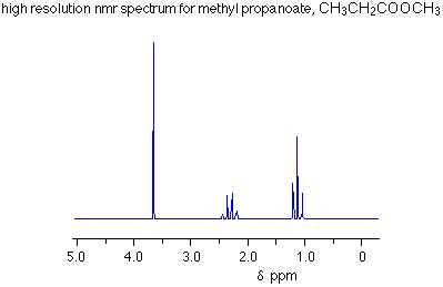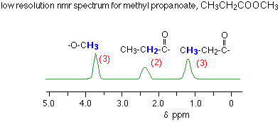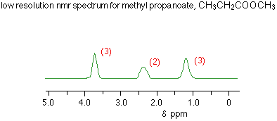 The numbers against the peaks represent the relative areas under each peak. That information is extremely important in interpreting the spectra. Interpreting a low resolution spectrum Using the total number of peaks Each peak represents a different environment for hydrogen atoms in the molecule. In the methyl propanoate spectrum above, there are three peaks because there are three different environments for the hydrogens. Remember that methyl propanoate is CH3CH2COOCH3. The hydrogens in the CH2 group are obviously in a different environment from those in the CH3 groups. The two CH3 groups aren't in the same environment either. One is attached to a CH2 group, the other to an oxygen. Using the areas under the peaks The ratio of the areas under the peaks tell you the ratio of the numbers of hydrogens in the various environments. In the methyl propanoate case, the areas were in the ratio of 3:2:3, which is exactly what you want for the two differently placed CH3 groups and the CH2 group. You will probably be told the relative areas under the peaks - especially if you are only looking at low resolution spectra, but it is just possible that you might have to work them out. NMR spectrometers have a device which draws another line on the spectrum called an integrator trace (or integration trace). You can measure the relative areas from this trace. | ||