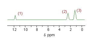 Showing these groups on the low resolution spectrum gives: Some sample questions Example 1 An organic compound was known to be one of the following. Use its low resolution NMR spectrum to decide which it is. Notice that there are three peaks showing three different environments for the hydrogens. That eliminates methyl ethanoate as a possibility because that would only give two peaks - due to the two differently situated CH3 group hydrogens. Does the ratio of the areas under the peaks help? Not in this case - both the other compounds would have three peaks in the ratio of 1:2:3. Now you need to look at the chemical shifts: Checking the positions of the various hydrogens in the two possible compounds against the chemical shift table gives you this pattern of shifts: Comparing these with the actual spectrum means that the substance was propanoic acid, CH3CH2COOH. Example 2 How would you use low resolution NMR to distinguish between the isomers propanone and propanal? The propanone would only give one peak in its NMR spectrum because both CH3 groups are in an identical environment - both are attached to -COCH3. The propanal would give three peaks with the areas underneath in the ratio 3:2:1. You could refer to the chemical shift table above to decide where the peaks are likely to be found, but it isn't really necessary. Example 3 How many peaks would there be in the low resolution NMR spectrum of the following compound, and what would be the ratio of the areas under the peaks? All the CH3 groups are exactly equivalent so would only produce 1 peak. There would also be peaks for the hydrogens in the CH2 group and the COOH group. There would be three peaks in total with areas in the ratio 9:2:1.