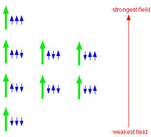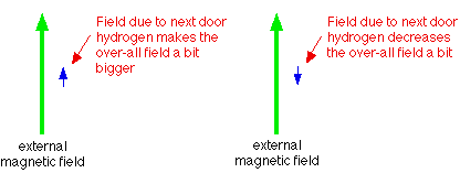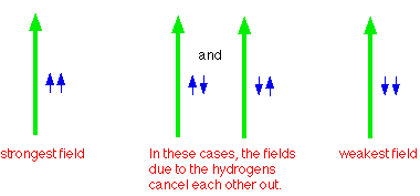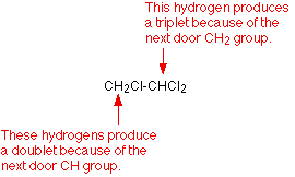 Focus on the CH2 group. Why is that a doublet? Remember that the peaks in an NMR spectrum are in different places because the hydrogens are experiencing different magnetic fields due to their different environments. Two peaks close together must mean that those particular hydrogens are experiencing two slightly different magnetic fields. Those two slightly different fields are caused by the hydrogen in the CH group next door. The hydrogen next door has a small magnetic field of its own, which could be aligned with the external magnetic field or opposed to it. Depending on which way around it is aligned, it will either strengthen or weaken the field felt by the CH2 hydrogens. There is an equal chance of either of these arrangements happening and so there will be two peaks due to the CH2 hydrogens, close together and with equal areas under them (because of the 50/50 chance of either arrangement). The origin of a triplet Now focus on the CH group in the compound CH2Cl-CHCl2. Why is that a triplet? It must be a triplet because that hydrogen is experiencing any one of three slightly different magnetic fields. Think about the magnetic alignments of the hydrogens on the next door CH2 group. These are the various possibilities: The two arrangements in the centre of the diagram produce the same field (exactly the same as the external field). So . . . there are three possible magnetic fields that the CH hydrogen could feel, and so there are three peaks close together - a triplet. The areas under the peaks are in the ratio of 1:2:1 because that represents the chances of these various magnetic fields occurring. The origin of a quartet If you apply the same sort of argument to hydrogens next door to a CH3 group, you will find that they could be experiencing any one of four different magnetic fields depending on the alignment of the CH3 hydrogens. All the arrangements in the second line produce the same field. All the alignments in the third line also produce the same field, but this time a bit smaller. There are four different possible fields, with the chances of them arising in the ratio 1:3:3:1. So a CH3 group produces a quartet in the spectrum of the hydrogens of the next door group, with the peak sizes in the ratio 1:3:3:1.