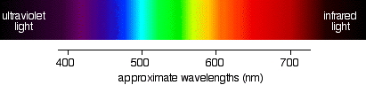 Important: This isn't a real spectrum - it's a made-up drawing. The colours are only an approximation, and so are the wavelengths assigned to them. It doesn't pretend to be accurate! | |||||||||||||||||