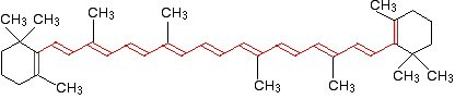 If you extend this to compounds with really massive delocalisation, the wavelength absorbed will eventually be high enough to be in the visible region of the spectrum, and the compound will then be seen as coloured. A good example of this is the orange plant pigment, beta-carotene - present in carrots, for example. Why is beta-carotene orange? Beta-carotene has the sort of delocalisation that we've just been looking at, but on a much greater scale with 11 carbon-carbon double bonds conjugated together. The diagram shows the structure of beta-carotene with the alternating double and single bonds shown in red.