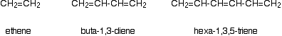 Ethene contains a simple isolated carbon-carbon double bond, but the other two have conjugated double bonds. In these cases, there is delocalisation of the pi bonding orbitals over the whole molecule. | |||||||||||||||||