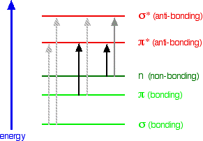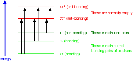 What happens when light is absorbed by molecules? Promotion of electrons When we were talking about the various sorts of orbitals present in organic compounds on the introductory page (see above), you will have come across this diagram showing their relative energies: