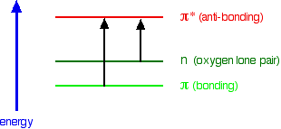 A chromophore producing two peaks A chromophore such as the carbon-oxygen double bond in ethanal, for example, obviously has pi electrons as a part of the double bond, but also has lone pairs on the oxygen atom. That means that both of the important absorptions from the last energy diagram are possible. | |||||||||||||||||