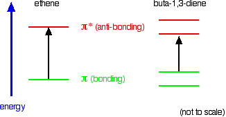 . . . and that's what is happening. Compare ethene with buta-1,3-diene. In ethene, there is one pi bonding orbital and one pi anti-bonding orbital. In buta-1,3-diene, there are two pi bonding orbitals and two pi anti-bonding orbitals. This is all discussed in detail on the introductory page that you should have read.