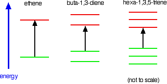 Note: In this case, you will have to work out for yourself why there are 3 bonding and 3 anti-bonding pi orbitals in the hexa-1,3,5-triene. If you are interested, you can work it out in the same way that I have used for buta-1,3-diene on the introductory page. It isn't essential that you do this - all that matters is that you can see the pattern - the more the delocalisation, the longer the wavelength absorbed. If you choose to follow this link, use the BACK button on your browser to come back here again later. | |||||||||||||||||
