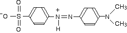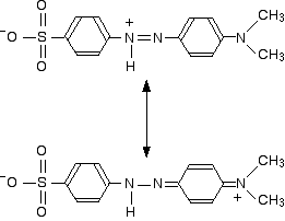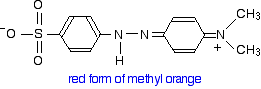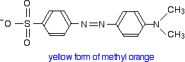 Methyl orange You will know that methyl orange is yellow in alkaline solutions and red in acidic ones. The structure in alkaline solution is: