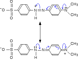 Important: If you have read the introductory page, you will know that the delocalisation doesn't extend out over the sulphonate group. That doesn't affect the rest of this argument in any way. This group isn't changed by the addition of a hydrogen ion. All we are actually interested in is the effect on the delocalisation over the rest of the molecule - the two benzene rings and the two nitrogen-containing groups. | |||||||||||||||||