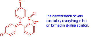 Both of these absorb light in the ultra-violet, but the one on the right also absorbs in the visible with a peak at 553 nm. The molecule in acid solution is colourless because our eyes can't detect the fact that some light is being absorbed in the ultra-violet. However, our eyes do detect the absorption at 553 nm produced by the form in alkaline solution. 553 nm is in the green region of the spectrum. If you look back at the colour wheel, you will find that the complementary colour of green is magenta - and that's the colour you see. So why does the colour change as the structure changes? What we have is a shift to absorption at a higher wavelength in alkaline solution. As we've already seen, a shift to higher wavelength is associated with a greater degree of delocalisation. Here is a modified diagram of the structure of the form in acidic solution - the colourless form. The extent of the delocalisation is shown in red.