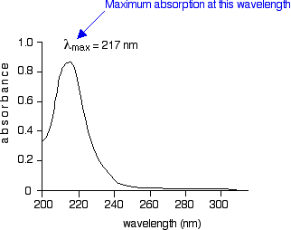 Note: The spectrum shown is only a simplified sketch graph - it doesn't pretend to any great accuracy! If you are really wide-awake you might wonder why the graph looks like it does with a broad absorption peak rather than a single line at 217 nm. A jump from a pi bonding orbital to a pi anti-bonding orbital ought to have a fixed energy and therefore absorb a fixed wavelength. The compound is in fact absorbing over a whole range of wavelengths suggesting a whole range of energy jumps. This problem arises because rotations and vibrations in the molecule are continually changing the energies of the orbitals - and that, of course, means that the gaps between them are continually changing as well. The result is that absorption takes place over a range of wavelengths rather than at one fixed one. You don't need to worry about this at this level. | |||||||||||||||||