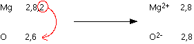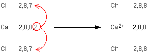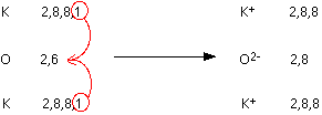 A negative ion is sometimes called an anion. The nature of the bond The sodium ions and chloride ions are held together by the strong electrostatic attractions between the positive and negative charges. The formula of sodium chloride You need one sodium atom to provide the extra electron for one chlorine atom, so they combine together 1:1. The formula is therefore NaCl. Some other examples of ionic bonding magnesium oxide Again, noble gas structures are formed, and the magnesium oxide is held together by very strong attractions between the ions. The ionic bonding is stronger than in sodium chloride because this time you have 2+ ions attracting 2- ions. The greater the charge, the greater the attraction. The formula of magnesium oxide is MgO. calcium chloride This time you need two chlorines to use up the two outer electrons in the calcium. The formula of calcium chloride is therefore CaCl2. potassium oxide Again, noble gas structures are formed. It takes two potassiums to supply the electrons the oxygen needs. The formula of potassium oxide is K2O. THE A'LEVEL VIEW OF IONIC BONDING