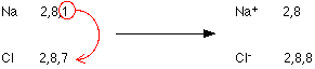 Ionic bonding in sodium chloride Sodium (2,8,1) has 1 electron more than a stable noble gas structure (2,8). If it gave away that electron it would become more stable. Chlorine (2,8,7) has 1 electron short of a stable noble gas structure (2,8,8). If it could gain an electron from somewhere it too would become more stable. The answer is obvious. If a sodium atom gives an electron to a chlorine atom, both become more stable. The sodium has lost an electron, so it no longer has equal numbers of electrons and protons. Because it has one more proton than electron, it has a charge of 1+. If electrons are lost from an atom, positive ions are formed. Positive ions are sometimes called cations. The chlorine has gained an electron, so it now has one more electron than proton. It therefore has a charge of 1-. If electrons are gained by an atom, negative ions are formed.