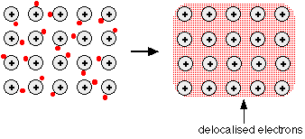 METALLIC BONDING This page introduces the bonding in metals. It explains how the metallic bond arises and why its strength varies from metal to metal. What is a metallic bond? Metallic bonding in sodium Metals tend to have high melting points and boiling points suggesting strong bonds between the atoms. Even a metal like sodium (melting point 97.8°C) melts at a considerably higher temperature than the element (neon) which precedes it in the Periodic Table. Sodium has the electronic structure 1s22s22p63s1. When sodium atoms come together, the electron in the 3s atomic orbital of one sodium atom shares space with the corresponding electron on a neighbouring atom to form a molecular orbital - in much the same sort of way that a covalent bond is formed. The difference, however, is that each sodium atom is being touched by eight other sodium atoms - and the sharing occurs between the central atom and the 3s orbitals on all of the eight other atoms. And each of these eight is in turn being touched by eight sodium atoms, which in turn are touched by eight atoms - and so on and so on, until you have taken in all the atoms in that lump of sodium. All of the 3s orbitals on all of the atoms overlap to give a vast number of molecular orbitals which extend over the whole piece of metal. There have to be huge numbers of molecular orbitals, of course, because any orbital can only hold two electrons. The outer electrons have become delocalised over the whole metal structure. This means that they are no longer attached to a particular atom or pair of atoms, but can be thought of as moving freely around in the whole structure. So each atom's outer electrons are involved in this delocalisation or sea of electrons. The rest of each atom (the nucleus and the inner electrons) is essentially a sodium ion, Na+. Metallic bonding is often described as an array of positive ions in a sea of electrons. The metal is held together by the strong forces of attraction between the delocalised electrons and the positive ions. Beware if you are going to use the term "an array of positive ions in a sea of electrons"! Is a metal made up of atoms or ions? It is made of atoms. Each positive centre in the diagram represents all the rest of the atom apart from the outer electron, but that electron hasn't been lost - it may no longer have an attachment to a particular atom, but it's still there in the structure. Sodium metal is therefore written as Na - not Na+. Metallic bonding in magnesium If you work through the same argument with magnesium, you end up with stronger bonds and so a higher melting point. Magnesium has the outer electronic structure 3s2. Both of these electrons become delocalised, so the "sea" has twice the electron density as it does in sodium. The remaining "ions" also have twice the charge and so there will be more attraction between "ions" and "sea". More realistically, each magnesium atom has 12 protons in the nucleus compared with sodium's 11. In both cases, the nucleus is screened from the delocalised electrons by the same number of inner electrons - the 10 electrons in the 1s2 2s2 2p6 orbitals. That means that there will be a net pull from the magnesium nucleus of 2+, but only 1+ from the sodium nucleus. So not only will there be a greater number of delocalised electrons in magnesium, but there will also be a greater attraction for them by the net pull from the magnesium nuclei. Magnesium atoms also have a slightly smaller radius than sodium atoms, and so the delocalised electrons are closer to the nuclei. Each magnesium atom also has twelve near neighbours rather than sodium's eight. Both of these factors increase the strength of the bond still further. Metallic bonding in transition elements Transition metals tend to have particularly high melting points and boiling points. The reason is that they can involve the 3d electrons in the delocalisation as well as the 4s. The more electrons you can involve, the stronger the attractions tend to be. | ||
