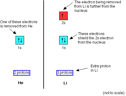 Note: This is actually very similar to the increase from, say, sodium to magnesium in the third period. In that case, the outer electronic structure is going from 3s1 to 3s2. Despite the pairing-up of the electrons, the ionisation energy increases because of the extra proton in the nucleus. The repulsion between the 3s electrons obviously isn't enough to outweigh this either. I don't know why the repulsion between the paired electrons matters less for electrons in s orbitals than in p orbitals (I don't even know whether you can make that generalisation!). I suspect that it has to do with orbital shape and possibly the greater penetration of s electrons towards the nucleus, but I haven't been able to find any reference to this anywhere. In fact, I haven't been able to find anyone who even mentions repulsion in the context of paired s electrons! If you have any hard information on this, could you contact me via the address on the about this site page. | |||||||||||||||||||||