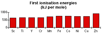 Lithium's outer electron is in the second level, and only has the 1s2 electrons to screen it. The 2s1 electron feels the pull of 3 protons screened by 2 electrons - a net pull from the centre of 1+. The sodium's outer electron is in the third level, and is screened from the 11 protons in the nucleus by a total of 10 inner electrons. The 3s1 electron also feels a net pull of 1+ from the centre of the atom. In other words, the effect of the extra protons is compensated for by the effect of the extra screening electrons. The only factor left is the extra distance between the outer electron and the nucleus in sodium's case. That lowers the ionisation energy. Similar explanations hold as you go down the rest of this group - or, indeed, any other group. Trends in ionisation energy in a transition series Apart from zinc at the end, the other ionisation energies are all much the same. All of these elements have an electronic structure [Ar]3dn4s2 (or 4s1 in the cases of chromium and copper). The electron being lost always comes from the 4s orbital. | |||||||||||||||||||||