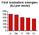 You can explain the increase in reactivity of the Group 1 metals (Li, Na, K, Rb, Cs) as you go down the group in terms of the fall in ionisation energy. Whatever these metals react with, they have to form positive ions in the process, and so the lower the ionisation energy, the more easily those ions will form. The danger with this approach is that the formation of the positive ion is only one stage in a multi-step process.