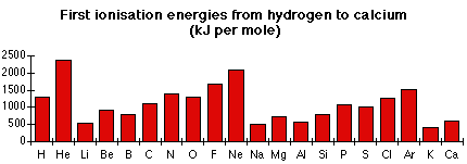 Things to notice about the equation The state symbols - (g) - are essential. When you are talking about ionisation energies, everything must be present in the gas state. Ionisation energies are measured in kJ mol-1 (kilojoules per mole). They vary in size from 381 (which you would consider very low) up to 2370 (which is very high). All elements have a first ionisation energy - even atoms which don't form positive ions in test tubes. The reason that helium (1st I.E. = 2370 kJ mol-1) doesn't normally form a positive ion is because of the huge amount of energy that would be needed to remove one of its electrons. Patterns of first ionisation energies in the Periodic Table The first 20 elements First ionisation energy shows periodicity. That means that it varies in a repetitive way as you move through the Periodic Table. For example, look at the pattern from Li to Ne, and then compare it with the identical pattern from Na to Ar. These variations in first ionisation energy can all be explained in terms of the structures of the atoms involved. Factors affecting the size of ionisation energy Ionisation energy is a measure of the energy needed to pull a particular electron away from the attraction of the nucleus. A high value of ionisation energy shows a high attraction between the electron and the nucleus. The size of that attraction will be governed by: The charge on the nucleus. The more protons there are in the nucleus, the more positively charged the nucleus is, and the more strongly electrons are attracted to it. The distance of the electron from the nucleus. Attraction falls off very rapidly with distance. An electron close to the nucleus will be much more strongly attracted than one further away. The number of electrons between the outer electrons and the nucleus. Consider a sodium atom, with the electronic structure 2,8,1. (There's no reason why you can't use this notation if it's useful!) If the outer electron looks in towards the nucleus, it doesn't see the nucleus sharply. Between it and the nucleus there are the two layers of electrons in the first and second levels. The 11 protons in the sodium's nucleus have their effect cut down by the 10 inner electrons. The outer electron therefore only feels a net pull of approximately 1+ from the centre. This lessening of the pull of the nucleus by inner electrons is known as screening or shielding. | |||||||||||||||||||||