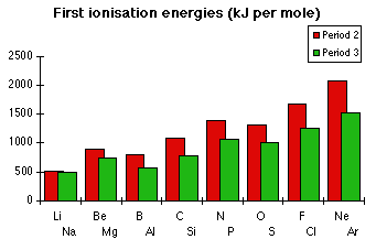 In period 3, the trend is exactly the same. This time, all the electrons being removed are in the third level and are screened by the 1s22s22p6 electrons. They all have the same sort of environment, but there is an increasing nuclear charge. Why the drop between groups 2 and 3 (Be-B and Mg-Al)? The explanation lies with the structures of boron and aluminium. The outer electron is removed more easily from these atoms than the general trend in their period would suggest.
