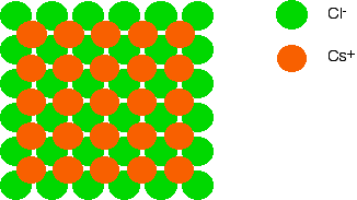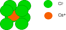 By reversing the colours (green chloride ion in the centre, and orange caesium ions surrounding it), you would have an exactly equivalent diagram for the arrangement of caesium ions around each chloride ion. | ||