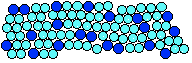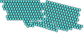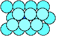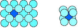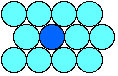 12-co-ordination Most metals are close packed - that is, they fit as many atoms as possible into the available volume. Each atom in the structure has 12 touching neighbours. Such a metal is described as 12-co-ordinated. Each atom has 6 other atoms touching it in each layer. There are also 3 atoms touching any particular atom in the layer above and another 3 in the layer underneath. This second diagram shows the layer immediately above the first layer. There will be a corresponding layer underneath. (There are actually two different ways of placing the third layer in a close packed structure, but that goes beyond the requirements of current A'level syllabuses.) 8-co-ordination Some metals (notably those in Group 1 of the Periodic Table) are packed less efficiently, having only 8 touching neighbours. These are 8-co-ordinated. The left hand diagram shows that no atoms are touching each other within a particular layer . They are only touched by the atoms in the layers above and below. The right hand diagram shows the 8 atoms (4 above and 4 below) touching the darker coloured one. Crystal grains It would be misleading to suppose that all the atoms in a piece of metal are arranged in a regular way. Any piece of metal is made up of a large number of "crystal grains", which are regions of regularity. At the grain boundaries atoms have become misaligned. | ||