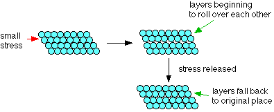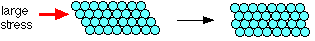 Electrical conductivity Metals conduct electricity. The delocalised electrons are free to move throughout the structure in 3-dimensions. They can cross grain boundaries. Even though the pattern may be disrupted at the boundary, as long as atoms are touching each other, the metallic bond is still present. Liquid metals also conduct electricity, showing that although the metal atoms may be free to move, the delocalisation remains in force until the metal boils. Thermal conductivity Metals are good conductors of heat. Heat energy is picked up by the electrons as additional kinetic energy (it makes them move faster). The energy is transferred throughout the rest of the metal by the moving electrons. Strength and workability Malleability and ductility Metals are described as malleable (can be beaten into sheets) and ductile (can be pulled out into wires). This is because of the ability of the atoms to roll over each other into new positions without breaking the metallic bond. If a small stress is put onto the metal, the layers of atoms will start to roll over each other. If the stress is released again, they will fall back to their original positions. Under these circumstances, the metal is said to be elastic. If a larger stress is put on, the atoms roll over each other into a new position, and the metal is permanently changed. The hardness of metals This rolling of layers of atoms over each other is hindered by grain boundaries because the rows of atoms don't line up properly. It follows that the more grain boundaries there are (the smaller the individual crystal grains), the harder the metal becomes. Offsetting this, because the grain boundaries are areas where the atoms aren't in such good contact with each other, metals tend to fracture at grain boundaries. Increasing the number of grain boundaries not only makes the metal harder, but also makes it more brittle. Controlling the size of the crystal grains If you have a pure piece of metal, you can control the size of the grains by heat treatment or by working the metal. Heating a metal tends to shake the atoms into a more regular arrangement - decreasing the number of grain boundaries, and so making the metal softer. Banging the metal around when it is cold tends to produce lots of small grains. Cold working therefore makes a metal harder. To restore its workability, you would need to reheat it. You can also break up the regular arrangement of the atoms by inserting atoms of a slightly different size into the structure. Alloys such as brass (a mixture of copper and zinc) are harder than the original metals because the irregularity in the structure helps to stop rows of atoms from slipping over each other.
