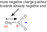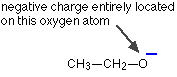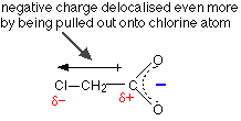 Delocalisation also occurs in this ion. This time, one of the lone pairs on the oxygen atom overlaps with the delocalised electrons on the benzene ring. This overlap leads to a delocalisation which extends from the ring out over the oxygen atom. As a result, the negative charge is no longer entirely localised on the oxygen, but is spread out around the whole ion. Why then is phenol a much weaker acid than ethanoic acid? Think about the ethanoate ion again. If there wasn't any delocalisation, the charge would all be on one of the oxygen atoms, like this: But the delocalisation spreads this charge over the whole of the COO group. Because oxygen is more electronegative than carbon, you can think of most of the charge being shared between the two oxygens (shown by the heavy red shading in this diagram). If there wasn't any delocalisation, one of the oxygens would have a full charge which would be very attractive towards hydrogen ions. With delocalisation, that charge is spread over two oxygen atoms, and neither will be as attractive to a hydrogen ion as if one of the oxygens carried the whole charge. That means that the ethanoate ion won't take up a hydrogen ion as easily as it would if there wasn't any delocalisation. Because some of it stays ionised, the formation of the hydrogen ions means that it is acidic. In the phenoxide ion, the single oxygen atom is still the most electronegative thing present, and the delocalised system will be heavily distorted towards it. That still leaves the oxygen atom with most of its negative charge. What delocalisation there is makes the phenoxide ion more stable than it would otherwise be, and so phenol is acidic to an extent. However, the delocalisation hasn't shared the charge around very effectively. There is still lots of negative charge around the oxygen to which hydrogen ions will be attracted - and so the phenol will readily re-form. Phenol is therefore only very weakly acidic. Ethanol Ethanol, CH3CH2OH, is so weakly acidic that you would hardly count it as acidic at all. If the hydrogen-oxygen bond breaks to release a hydrogen ion, an ethoxide ion is formed: This has nothing at all going for it. There is no way of delocalising the negative charge, which remains firmly on the oxygen atom. That intense negative charge will be highly attractive towards hydrogen ions, and so the ethanol will instantly re-form. Since ethanol is very poor at losing hydrogen ions, it is hardly acidic at all. Variations in acid strengths between different carboxylic acids You might think that all carboxylic acids would have the same strength because each depends on the delocalisation of the negative charge around the -COO- group to make the anion more stable, and so more reluctant to re-combine with a hydrogen ion. In fact, the carboxylic acids have widely different acidities. One obvious difference is between methanoic acid, HCOOH, and the other simple carboxylic acids: