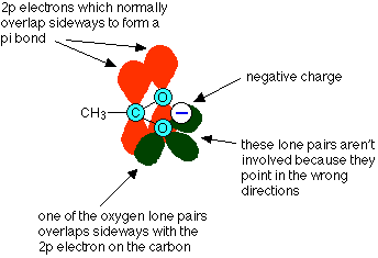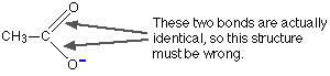 Warning! If you don't already understand about the bonding in the carbon-oxygen double bond, you would be well advised to skip this next bit - all the way down to the simplified structure of the ethanoate ion towards the end of it. It goes beyond anything that you are likely to want for UK A level purposes. If you do choose to follow this link, it will probably take you to several other pages before you are ready to come back here again. Use the BACK button (or HISTORY file or GO menu) on your browser to return to this page. | |||||||||||||||||||||||||||||||||