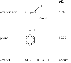 A hydroxonium ion is formed together with the anion (negative ion) from the acid. This equilibrium is sometimes simplified by leaving out the water to emphasise the ionisation of the acid. If you write it like this, you must include the state symbols - "(aq)". Writing H+(aq) implies that the hydrogen ion is attached to a water molecule as H3O+. Hydrogen ions are always attached to something during chemical reactions. The organic acids are weak in the sense that this ionisation is very incomplete. At any one time, most of the acid will be present in the solution as un-ionised molecules. For example, in the case of dilute ethanoic acid, the solution contains about 99% of ethanoic acid molecules - at any instant, only about 1% have actually ionised. The position of equilibrium therefore lies well to the left. Comparing the strengths of weak acids The strengths of weak acids are measured on the pKa scale. The smaller the number on this scale, the stronger the acid is. Three of the compounds we shall be looking at, together with their pKa values are: Remember - the smaller the number the stronger the acid. Comparing the other two to ethanoic acid, you will see that phenol is very much weaker with a pKa of 10.00, and ethanol is so weak with a pKa of about 16 that it hardly counts as acidic at all! Why are these acids acidic? In each case, the same bond gets broken - the bond between the hydrogen and oxygen in an -OH group. Writing the rest of the molecule as "X": | |||||||||||||||||||||||||||||||||