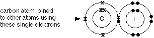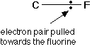 That means that fluorine attracts the bonding pair much more strongly than carbon does. The bond - on average - will look like this: Why is fluorine more electronegative than carbon? A simple dots-and-crosses diagram of a C-F bond is perfectly adequate to explain it. The bonding pair is in the second energy level of both carbon and fluorine, so in the absence of any other effect, the distance of the pair from both nuclei would be the same. The electron pair is shielded from the full force of both nuclei by the 1s electrons - again there is nothing to pull it closer to one atom than the other. BUT, the fluorine nucleus has 9 protons whereas the carbon nucleus has only 6. Allowing for the shielding effect of the 1s electrons, the bonding pair feels a net pull of about 4+ from the carbon, but about 7+ from the fluorine. It is this extra nuclear charge which pulls the bonding pair (on average) closer to the fluorine than the carbon. | |||||