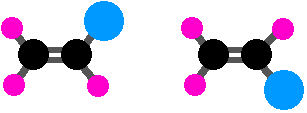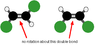 Note: In the model, the reason that you can't rotate a carbon-carbon double bond is that there are two links joining the carbons together. In reality, the reason is that you would have to break the pi bond. Pi bonds are formed by the sideways overlap between p orbitals. If you tried to rotate the carbon-carbon bond, the p orbitals won't line up any more and so the pi bond is disrupted. This costs energy and only happens if the compound is heated strongly. If you are interested in the bonding in carbon-carbon double bonds, follow this link. Be warned, though, that you might have to read several pages of background material and it could all take a long time. It isn't necessary for understanding the rest of this page. | |||||||||||||||||||