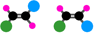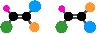 Think about this case: Although we've swapped the right-hand groups around, these are still the same molecule. To get from one to the other, all you would have to do is to turn the whole model over. You won't have geometric isomers if there are two groups the same on one end of the bond - in this case, the two pink groups on the left-hand end. So . . . there must be two different groups on the left-hand carbon and two different groups on the right-hand one. The cases we've been exploring earlier are like this: But you could make things even more different and still have geometric isomers: Here, the blue and green groups are either on the same side of the bond or the opposite side. Or you could go the whole hog and make everything different. You still get geometric isomers, but by now the words cis and trans are meaningless. This is where the more sophisticated E-Z notation comes in. Summary To get geometric isomers you must have: