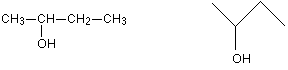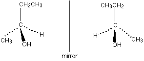 If there are two groups the same attached to the central carbon atom, the molecule has a plane of symmetry. If you imagine slicing through the molecule, the left-hand side is an exact reflection of the right-hand side. Where there are four groups attached, there is no symmetry anywhere in the molecule. A molecule which has no plane of symmetry is described as chiral. The carbon atom with the four different groups attached which causes this lack of symmetry is described as a chiral centre or as an asymmetric carbon atom. The molecule on the left above (with a plane of symmetry) is described as achiral. Only chiral molecules have optical isomers. The relationship between the enantiomers One of the enantiomers is simply a non-superimposable mirror image of the other one. In other words, if one isomer looked in a mirror, what it would see is the other one. The two isomers (the original one and its mirror image) have a different spatial arrangement, and so can't be superimposed on each other. If an achiral molecule (one with a plane of symmetry) looked in a mirror, you would always find that by rotating the image in space, you could make the two look identical. It would be possible to superimpose the original molecule and its mirror image. Some real examples of optical isomers Butan-2-ol The asymmetric carbon atom in a compound (the one with four different groups attached) is often shown by a star. It's extremely important to draw the isomers correctly. Draw one of them using standard bond notation to show the 3-dimensional arrangement around the asymmetric carbon atom. Then draw the mirror to show the examiner that you know what you are doing, and then the mirror image. | ||