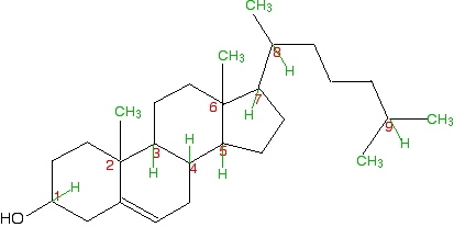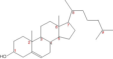 In this case, everything is as before, except that if you trace around the ring clockwise and anticlockwise from the carbon at the bottom of the ring, there is an identical pattern in both directions. You can think of the bottom carbon being attached to a hydrogen, an -OH group, and two identical hydrocarbon groups. It therefore isn't a chiral centre. The other thing which is very noticeable about this molecule is that there is a plane of symmetry through the carbon atom we are interested in. If you chopped it in half through this carbon, one side of the molecule would be an exact reflection of the other. In the first ring molecule above, that isn't the case. If you can see a plane of symmetry through the carbon atom it won't be a chiral centre. If there isn't a plane of symmetry, it will be a chiral centre. A seriously complicated example - cholesterol The skeletal diagram shows the structure of cholesterol. Some of the carbon atoms have been numbered for discussion purposes below. These are not part of the normal system for numbering the carbon atoms in cholesterol.