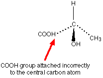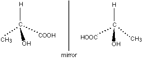 Notice that you don't literally draw the mirror images of all the letters and numbers! It is, however, quite useful to reverse large groups - look, for example, at the ethyl group at the top of the diagram. It doesn't matter in the least in what order you draw the four groups around the central carbon. As long as your mirror image is drawn accurately, you will automatically have drawn the two isomers. So which of these two isomers is (+)butan-2-ol and which is (-)butan-2-ol? There is no simple way of telling that. For A'level purposes, you can just ignore that problem - all you need to be able to do is to draw the two isomers correctly. 2-hydroxypropanoic acid (lactic acid) Once again the chiral centre is shown by a star. The two enantiomers are: It is important this time to draw the COOH group backwards in the mirror image. If you don't there is a good chance of you joining it on to the central carbon wrongly. If you draw it like this in an exam, you won't get the mark for that isomer even if you have drawn everything else perfectly. 2-aminopropanoic acid (alanine) This is typical of naturally-occurring amino acids. Structurally, it is just like the last example, except that the -OH group is replaced by -NH2 The two enantiomers are: Only one of these isomers occurs naturally: the (+) form. You can't tell just by looking at the structures which this is. It has, however, been possible to work out which of these structures is which. Naturally occurring alanine is the right-hand structure, and the way the groups are arranged around the central carbon atom is known as an L- configuration. Notice the use of the capital L. The other configuration is known as D-. So you may well find alanine described as L-(+)alanine. That means that it has this particular structure and rotates the plane of polarisation clockwise. Even if you know that a different compound has an arrangement of groups similar to alanine, you still can't say which way it will rotate the plane of polarisation. The other amino acids, for example, have the same arrangement of groups as alanine does (all that changes is the CH3 group), but some are (+) forms and others are (-) forms. It's quite common for natural systems to only work with one of the enantiomers of an optically active substance. It isn't too difficult to see why that might be. Because the molecules have different spatial arrangements of their various groups, only one of them is likely to fit properly into the active sites on the enzymes they work with. In the lab, it is quite common to produce equal amounts of both forms of a compound when it is synthesised. This happens just by chance, and you tend to get racemic mixtures. | ||