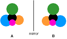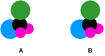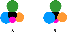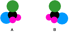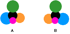 How optical isomers arise The examples of organic optical isomers required at A' level all contain a carbon atom joined to four different groups. These two models each have the same groups joined to the central carbon atom, but still manage to be different: Obviously as they are drawn, the orange and blue groups aren't aligned the same way. Could you get them to align by rotating one of the molecules? The next diagram shows what happens if you rotate molecule B. They still aren't the same - and there is no way that you can rotate them so that they look exactly the same. These are isomers of each other. They are described as being non-superimposable in the sense that (if you imagine molecule B being turned into a ghostly version of itself) you couldn't slide one molecule exactly over the other one. Something would always be pointing in the wrong direction. | ||