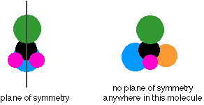 What happens if two of the groups attached to the central carbon atom are the same? The next diagram shows this possibility. The two models are aligned exactly as before, but the orange group has been replaced by another pink one. Rotating molecule B this time shows that it is exactly the same as molecule A. You only get optical isomers if all four groups attached to the central carbon are different. Chiral and achiral molecules The essential difference between the two examples we've looked at lies in the symmetry of the molecules.
