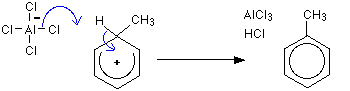 This page gives you the facts and a simple, uncluttered mechanism for the electrophilic substitution reaction between benzene and chloromethane in the presence of an aluminium chloride catalyst. Any other chloroalkane would work similarly. If you want the Friedel-Crafts alkylation mechanism explained to you in detail, there is a link at the bottom of the page. The electrophilic substitution reaction between benzene and chloromethane What is alkylation? Alkylation means substituting an alkyl group into something - in this case into a benzene ring. A hydrogen on the ring is replaced by a group like methyl or ethyl and so on. The facts Benzene is treated with a chloroalkane (for example, chloromethane or chloroethane) in the presence of aluminium chloride as a catalyst. On this page, we will look at substituting a methyl group, but any other alkyl group could be used in the same way. Substituting a methyl group gives methylbenzene - once known as toluene. or better: The aluminium chloride isn't written into these equations because it is acting as a catalyst. If you wanted to include it, you could write AlCl3 over the top of the arrow. | |
