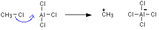 Aluminium chloride, AlCl3, is an electron deficient molecule. It is covalently bonded, but because the aluminium is only forming 3 bonds, and has no lone pairs, there are only 6 electrons around the aluminium atom rather than 8. It takes a chlorine (as a chloride ion) from the chloromethane, and forms a co-ordinate (dative covalent) bond with it. | |