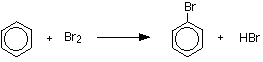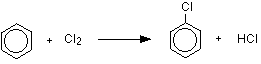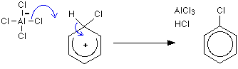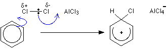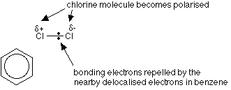 This page gives you the facts and a simple, uncluttered mechanism for the electrophilic substitution reaction between benzene and chlorine or bromine in the presence of a catalyst such as aluminium chloride or iron. If you want this mechanism explained to you in detail, there is a link at the bottom of the page. The electrophilic substitution reaction between benzene and chlorine or bromine The facts Benzene reacts with chlorine or bromine in an electrophilic substitution reaction, but only in the presence of a catalyst. The catalyst is either aluminium chloride (or aluminium bromide if you are reacting benzene with bromine) or iron. Strictly speaking iron isn't a catalyst, because it gets permanently changed during the reaction. It reacts with some of the chlorine or bromine to form iron(III) chloride, FeCl3, or iron(III) bromide, FeBr3. These compounds act as the catalyst and behave exactly like aluminium chloride in these reactions. The reaction with chlorine The reaction between benzene and chlorine in the presence of either aluminium chloride or iron gives chlorobenzene. or: The reaction with bromine The reaction between benzene and bromine in the presence of either aluminium bromide or iron gives bromobenzene. Iron is usually used because it is cheaper and more readily available. or: The formation of the electrophile We are going to explore the reaction using chlorine and aluminium chloride. If you want one of the other combinations, all you have to do is to replace each Cl by Br, or each Al by Fe. As a chlorine molecule approaches the benzene ring, the delocalised electrons in the ring repel electrons in the chlorine-chlorine bond. It is the slightly positive end of the chlorine molecule which acts as the electrophile. The presence of the aluminium chloride helps this polarisation. The electrophilic substitution mechanism Stage one Stage two The hydrogen is removed by the AlCl4- ion which was formed in the first stage. The aluminium chloride catalyst is re-generated in this second stage.
