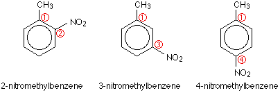 The nitration of methylbenzene If you substitute a nitro group, -NO2, into the benzene ring in methylbenzene, you could possibly get any of the following products: The carbon with the methyl group attached is thought of as the number 1 carbon, and the ring is then numbered around from 1 to 6. You number in a direction (in this case, clockwise) which produces the smaller number in the name - hence 2-nitromethylbenzene rather than 6-nitromethylbenzene. In the case of methylbenzene, whatever you attach to the ring, you always get a mixture consisting mainly of the 2- and 4- isomers. The methyl group is said to be 2,4-directing, in the sense that it seems to "push" incoming groups into those positions. | |