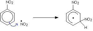 For example, the complete mechanism for substitution into the 4- position is: Stage one Stage two Electrophilic substitution in nitrobenzene Substitution into the 3- position (the first step) Methyl groups direct new groups into the 2- and 4- positions, but a nitro group, -NO2, already on the ring directs incoming groups into the 3- position. For example, if the temperature is raised above 50°C, the nitation of benzene doesn't just produce nitrobenzene - it also produces some 1,3-dinitrobenzene. A second nitro group is substituted into the ring in the 3- position. The mechanism is exactly the same as the nitration of benzene or of methylbenzene - you just have to be careful in drawing the intermediate ion. Draw the partial delocalisation to include all the carbons except for the one the new -NO2 group gets attached to. In the second stage, the hydrogen atom is then removed by an HSO4- ion - exactly as in the benzene case. This isn't shown because there's nothing new.