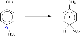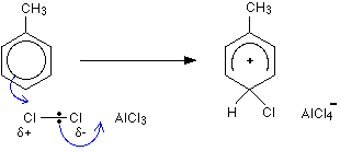 Reacting methylbenzene with a mixture of concentrated nitric and sulphuric acids gives both 2-nitromethylbenzene and 4-nitromethylbenzene. The mechanism is exactly the same as the nitration of benzene. You just have to be careful about the way that you draw the structure of the intermediate ion. Making 2-nitromethylbenzene (the first step) This just shows the first step of the electrophilic substitution reaction. Notice that the partial delocalisation in the intermediate ion covers all the carbon atoms in the ring except for the one that the -NO2 group gets attached to. That is the only point of interest in this example - everything else is just the same as with the nitration of benzene. The hydrogen atom is then removed by an HSO4- ion - exactly as in the benzene case. Making 4-nitromethylbenzene (the first step) Once again, the only point of interest is in the way the partial delocalisation in the intermediate ion is drawn - again, it covers all the carbon atoms in the ring apart from the one with the -NO2 group attached. The electrophilic substitution reaction between methylbenzene and chlorine This is a good example of a case where what is already attached to the ring can also get involved in the reaction. It is possible to get two quite different substitution reactions between methylbenzene and chlorine depending on the conditions used. The chlorine can substitute into the ring or into the methyl group. Here we are only interested in substitution into the ring. This happens in the presence of aluminium chloride or iron, and in the absence of UV light. | |